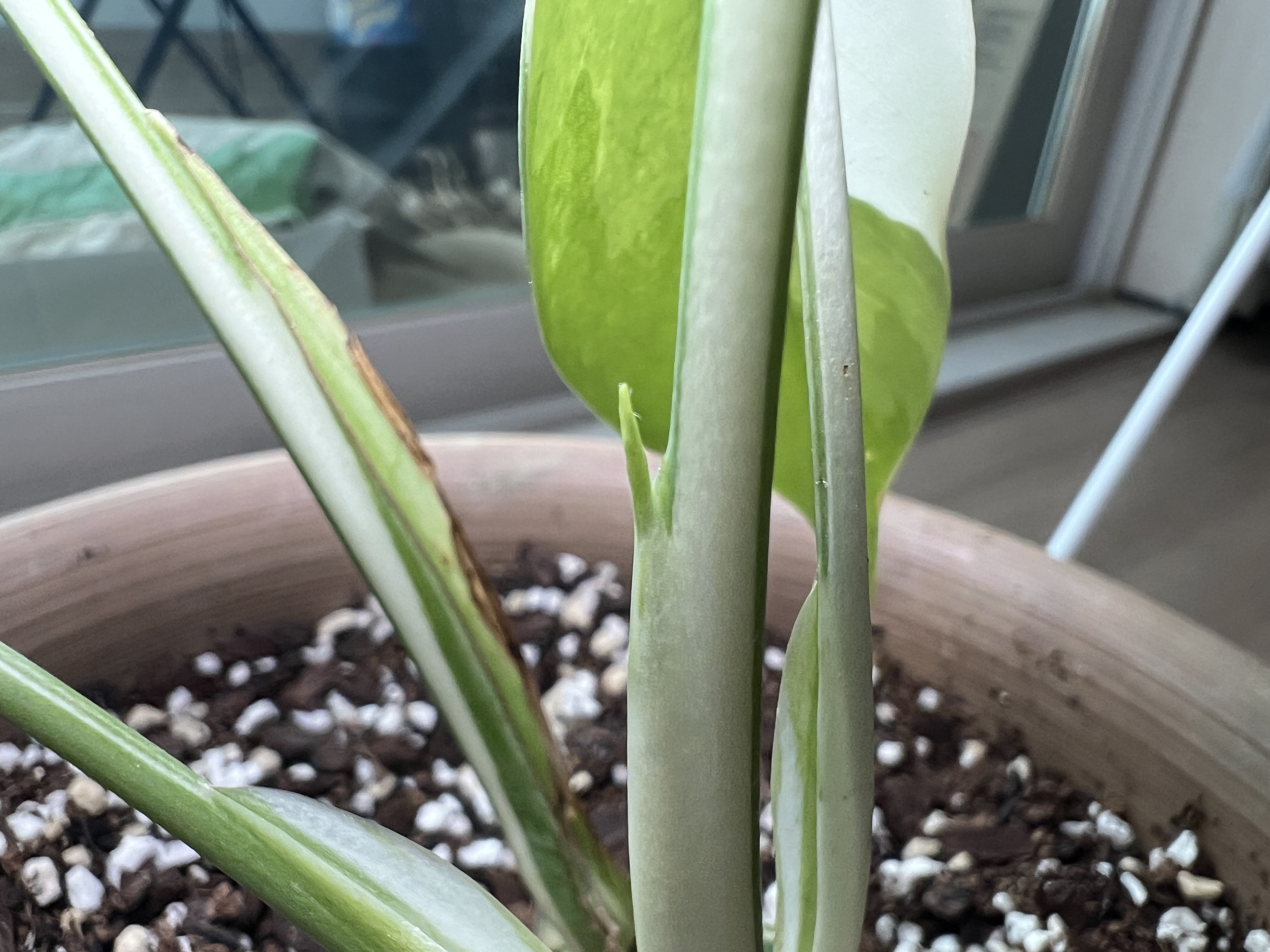 집에 몬스테라 알보가 하나 있다. 예전에 식테크가 한참 유행하다 지나갔을 때 저렴하게 나온 아이를 하나 구매했었다. 그때는 잎이 하나밖에 없었다. 약 1년 정도를 키웠는데 잎사귀가 하나 나오더니 더 자라지 않는것 같아 나는 식물을 못키우나보다 생각했더랬다. 그런데 식물등을 켜주고 약 3달정도가 지났는데 어느새 잎이 네장이 되었다. 빛이 없어서 그랬구나.. 분갈이할때는 뿌리가 잔뜩 나 있길래 위로는 안자라고 뿌리만 자라고 있었다. 지금 생각해보면 다 빛이 부족해서 뿌리만 더 키우는 것이었던것 같다. 어쨌든 잎이 4개가 되었는데 작은 순이 또 솟아오르고 있다. 보다시피 아래있는 잎사귀가 제일 작고 나중에 나온 잎이 제일 크다. 빛을 못봐서 그랬다니;;; 진작 식물등이라도 켜줄걸 그랬다. 새순이 솟아오르는 모..